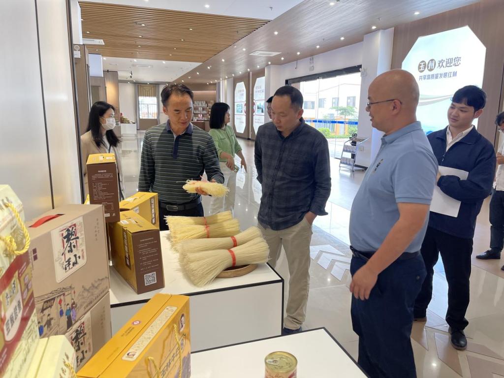 许进杰经理向基地工作人员了解“玉林靓货”品牌运营情况