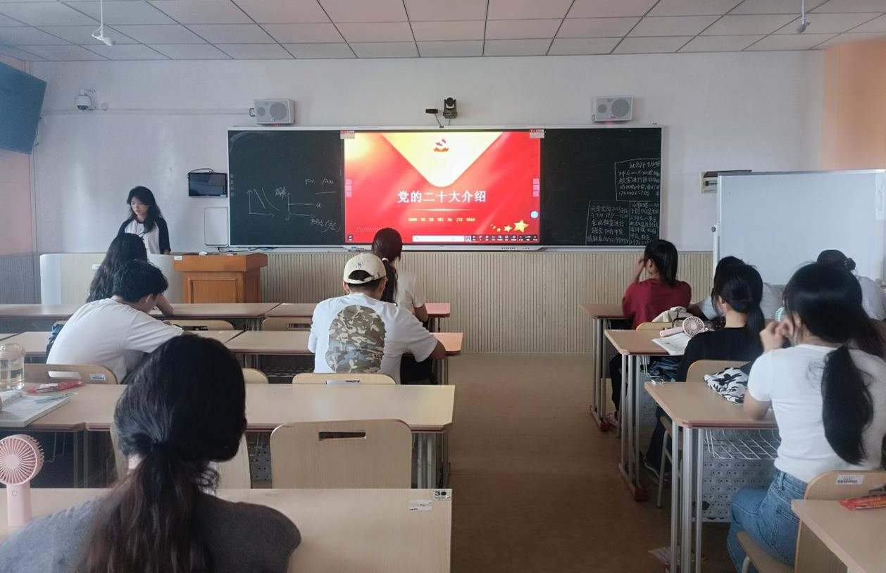 班会以讲PPT形式开展,团支书李纯同学首先是对党的二十大进行介绍,让同学们对党的二十大有一个深刻的了解;其次是说明党的二十大精神的重大意义;最后是号召同学们学习领会党的二十大精神,坚定理想信念,勇往直前。
