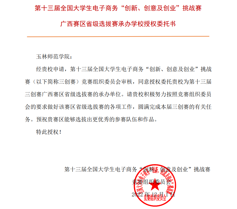 经学校申请,广西壮族自治区教育厅同意、第十三届全国老员工电子商务“创新、创意及创业”挑战赛竞赛组织委员授权,公司获第十三届全国老员工电子商务“创新、创意及创业”挑战赛广西赛区省级选拔赛承办授权。
