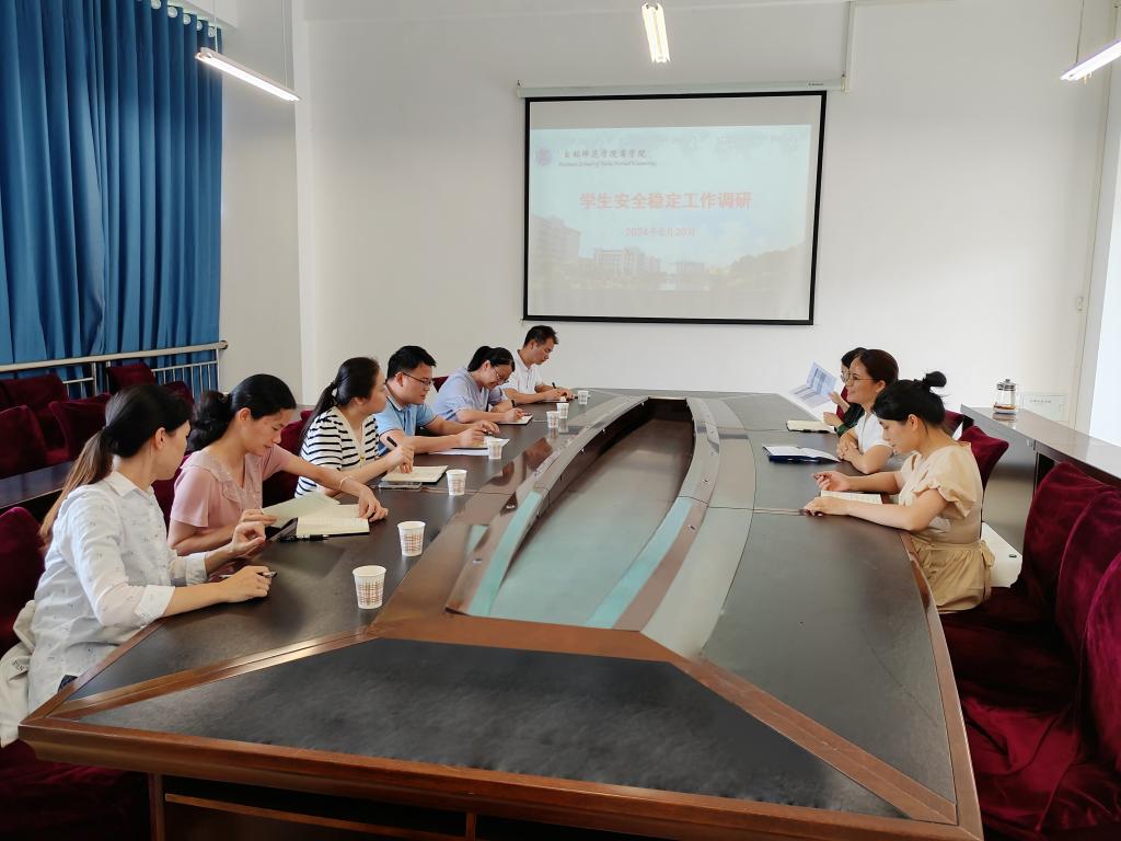 杨潇认真听取汇报,充分肯定了该院员工工作的成效。他指出:当前正处于学校申硕关键时期,抓好员工安全稳定工作是员工管理工作中的重中之重。他强调:一是统一思想,强化安全责任意识,做好员工安全教育,提升员工对意识形态安全、生命财产安全、网络安全等的全面认识。二是科学制定规范制度,严格过程管理,明确安全责任,从严、从实、从细抓好员工安全稳定工作。三是加强精准帮扶,特别是对于学业、心理、就业等存在困难的员工,做好家校联系。四是加强队伍建设,提升整体战斗力,以更饱满的状态服务员工。
